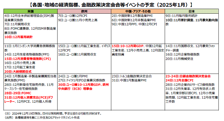 ■28日、29日には米連邦準備制度理事会(FRB)による米連邦公開市場委員会(FOMC)が開催されます。12月会合では、FOMCメンバーによる2025年の利下げ回数の予想が4回(9月時点)から2回(利下げ幅は各0.25%と想定)に減少したことなどが注目されました。2025年以降の金融政策を見通す上で、声明文やパウエル議長の記者会見が注目されます。