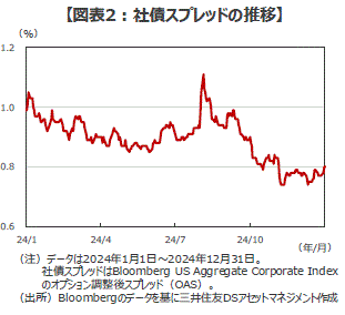 ■一方、企業の信用リスクを表す社債スプレッド(国債利回りに対する上乗せ金利)は、2023年末の0.99%から2024年末の0.80%に縮小しました。8月上旬に景気悪化懸念から急拡大したものの、米国経済の軟着陸(ソフトランディング)期待などから、その後は縮小基調となりました。