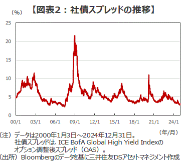 ■こうした環境下、2025年のハイイールド債市場は底堅く推移すると予想します。社債スプレッドの縮小余地は限られるものの、好調な米景気を背景に企業の信用力は大きく悪化はせず、社債スプレッドは比較的低水準で推移するとみています。また、高利回り社債に対する投資家の根強い買い需要から、ハイイールド債への資金流入は続くと見込んでいます。