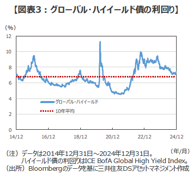 ■2024年末のグローバル・ハイイールド債の利回りは7.42%と、2023年末の7.85%から低下しました。それでも過去10年の平均利回りの6.80%を上回っています。