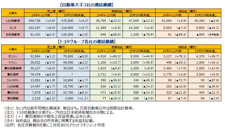 ■自動車大手の2024年度4-12月期決算では、認証問題の影響で生産が停滞したトヨタを除くと、各社北米を中心に販売台数を伸ばしました。エンジンとモーターの両方を駆動力として使うハイブリッド車は需要が大きく伸び、採算性も非常に高いようです。一方、旧型車やバッテリー式電気自動車(BEV)など需要が弱い車種では販売奨励金が増加し、各社の利益を圧迫しているようです。また、中国では各社販売台数を大きく落とし、持ち分法損益が悪化しています。これが24年度に営業利益に比べ純利益が大きく悪化する要因です。なお、トヨタは4-12月期に営業外収益として、外貨建て運用資産の利益に対する多額の為替差益を計上した模様です。
