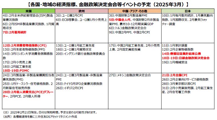 ■18、19日には、米連邦準備制度理事会(FRB)が連邦公開市場委員会(FOMC)を開催します。トランプ大統領が1月の就任以来、多くの関税政策を指示していることから、先行きの物価上昇に対する懸念が高まっています。加えて、足元の経済・物価動向が堅調に推移していることもあり、市場では利下げ時期が後ろ倒しされるとの見方が強まっています。今会合では、声明文やパウエルFRB議長の記者会見の他、FOMCメンバーによる2025年以降の政策金利の見通しなども注目されます。