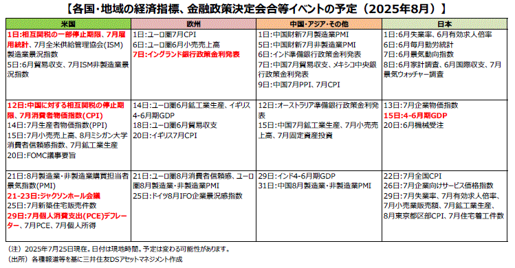 ■21~23日、米国のワイオミング州において経済シンポジウム「ジャクソンホール会議」が開催されます。同会議は、各国・地域の中央銀行総裁や経済学者らが経済政策について議論する、毎年8月の重要イベントです。1月に就任したトランプ大統領による関税政策が世界経済の不透明感を高めていることもあり、パウエル米連邦準備制度理事会(FRB)議長をはじめとした、参加者による議論内容や発言が特に注目されています。