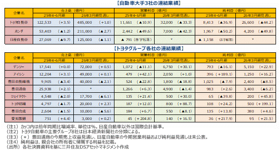 ■トヨタグループ各社の25年度4-6月期決算は、トヨタの販売台数が増加した恩恵を受けました。ハイブリッド車向けの利益率の高い部品や先進運転支援システムの売上高も順調に拡大しています。また、BEVの失速により、オートマ製品などで残存者メリットも発生しているようです。米国の自動車部品関税に関しては、トヨタは納入価格への全面転嫁を認めるようですが、他の自動車メーカーとの交渉では価格転嫁が遅れるケースが出ているようです。競争力が強くグループ外への売上高構成が高いことが、逆に今後の懸念材料となっています。