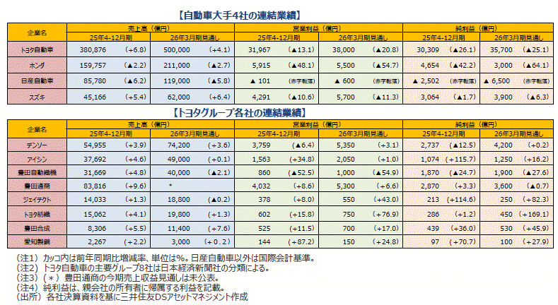 ■期初の想定以上に原価改善の進展や円安の恩恵から、ジェイテクトと豊田合成が営業利益予想を引き上げました。デンソーは、売上高は予想以上に拡大する見込みですが、想定していなかった品質費用が発生し、営業利益を下方修正しました。他のグループ会社は、4-12月期は順調としながらも、営業利益予想を据え置きました。