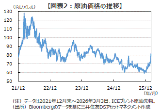 ■今回は、イランの報復攻撃が続いていることや、中東周辺国へと紛争が拡大する可能性に加え、ホルムズ海峡の実質封鎖が長期化するリスクにも留意が必要とみられます。ただし、原油価格が100ドル/バレルを上回る水準で長期に定着しない限り、世界経済や金融市場に与える影響は限定的にとどまるとみられます。実際、ブレント原油先物の値動きを確認すると、直近(3月3日時点)で80ドル台前半への上昇にとどまっています(図表2)。