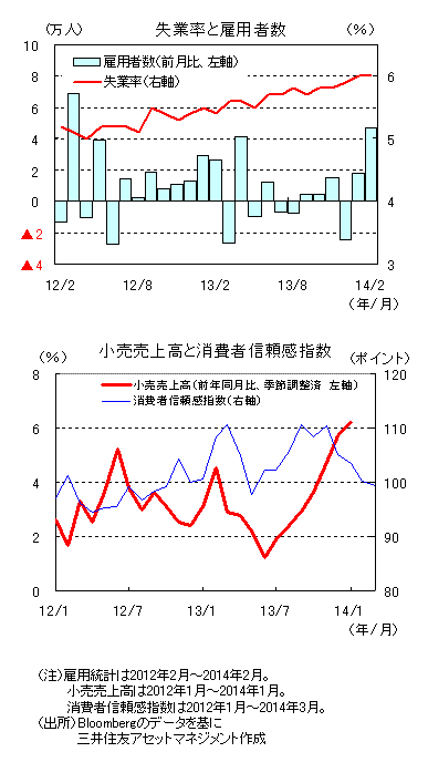 1月の小売売上高(季節調整済)は前年同月比+6.2%と、12月の同+5.7%を上回りました。前月比でも+1.2%と市場予想の同+0.4%を大きく上回りました。一方、先行きの参考となる3月の消費者信頼感指数は99.5ポイントと、2月の100.2ポイントから低下しました。中立水準の100ポイントを下回るのは、昨年5月以来のことです。