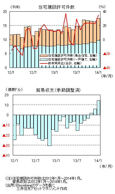 過去最低水準の金利や住宅価格の上昇観測などを背景に、住宅建設許可件数は一段と伸びました。1月の住宅建設許可件数(集合、一戸建ての合計)は前年同月比+34.6%の1万7,514件となりました。この件数は2002年10月以来の高水準です。