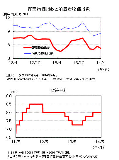 4月の卸売物価指数は前年同月比+5.20%と前月(同+5.70%)から低下しました。同指数は貿易財のウェイトが大きく、昨年9月以降のインドルピーの安定化も影響していると見られます。一方、RBIが重視する消費者物価指数は4月に同+8.59%と前月(同+8.31%)から上昇しました。いくつかの州で悪天候により果物価格が上昇したことが主な理由です。