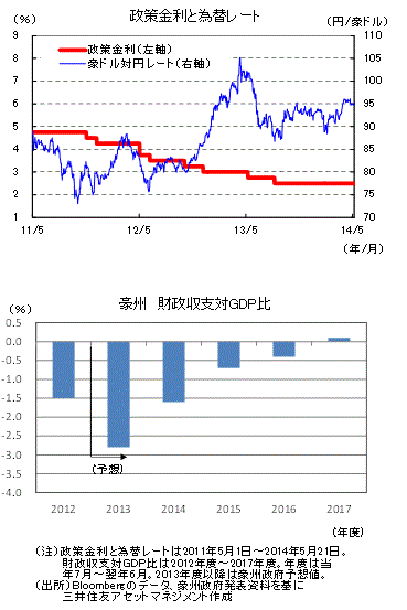 2014年の成長ペースは、2014年度予算案が企業活動に配慮しつつも緊縮的な内容となったことなどから、RBAが予想するように年+3.0%をやや下回る程度と見られます。しかし、来年以降は、資源輸出が追い風となるほか、個人消費の底堅さなどを背景に、成長ペースは徐々に加速していきそうです。こうしたことから、RBAは年内の政策金利を過去最低水準の2.5%で据え置くと思われます。