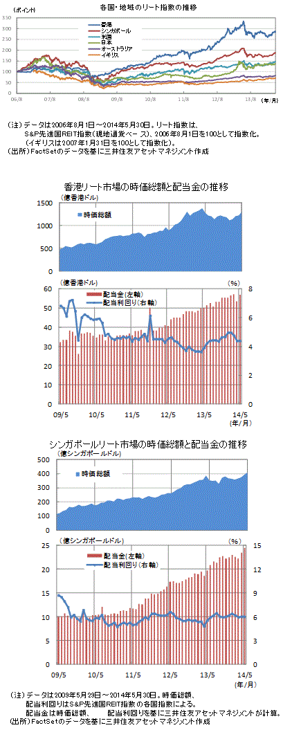 (*1)香港の主要3リートはリンク・リート(商業施設)、チャンピオン・リート(商業、複合施設)、フォーチュン・リート(商業施設)で同市場の時価総額の8割を占めます。シンガポールの主要5リートは、キャピタルモール・リート(商業施設)、アセンダス・リート(産業施設)、キャピタルコマーシャル・リート(オフィスビル)、サンテック・リート(オフィスビル)、ケッペル・リート(オフィスビル)で同市場のS&P先進国REIT指数の時価総額の約4割強を占めます。