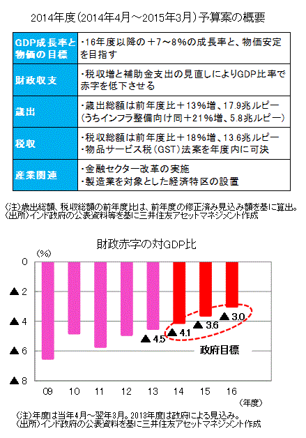 発表された予算案では、道路や鉄道関連支出など、インフラ整備向けの支出に重点が置かれました。14年度の経済成長率は前年度比+5.4~5.9%と予測され、16年度以降に同+7~8%の経済成長の実現を目指すとされました。