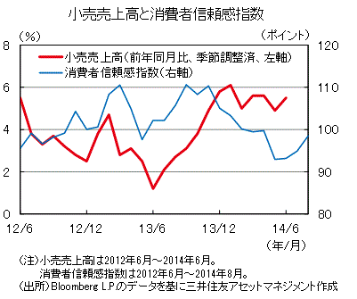 ■6月の小売売上高(季節調整済)は、前年同月比+5.5%と前月(同+4.9%)から上昇しました。先行きの参考となる消費者信頼感指数の上昇などから、消費は底堅い推移が見込まれます。