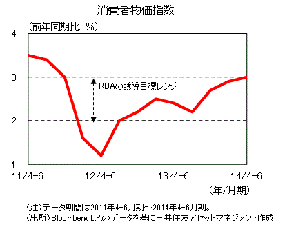■4-6月期の消費者物価指数(CPI)は、前年同期比+3.0%となり、オーストラリア準備銀行(以下、RBA)の誘導目標レンジ上限に達しました。RBAは主に輸入品の価格が過去1年程度のCPIを押し上げたと見ています。