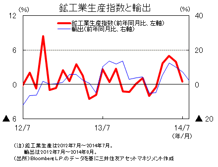 ■7月の鉱工業生産指数は、輸出の減速などにより前年同月比+0.5%と前月(同+3.9%、改定値)から伸びが鈍化しました。ただし、生産は前年比での増加を維持しています。