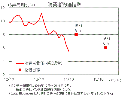■物価上昇率は、原油価格の下落や通貨の安定などから、RBIの2015年1月の目標である8%以下を達成しそうです。RBIは、物価の落ち着きが 見込まれることから、2015年前半にも利下げに踏み切りそうです。