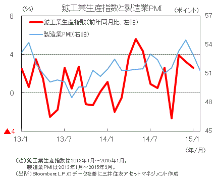 ■2015年1月の鉱工業生産指数は、前年同月比+2.6%とプラスを維持しました。自動車など耐久消費財の増加を主な要因として生産は緩やかに回復しています。生産の先行指標となる企業景況感は、原油安などによる企業コストの低下や政策効果による需要の拡大期待などを背景に改善傾向にあります。