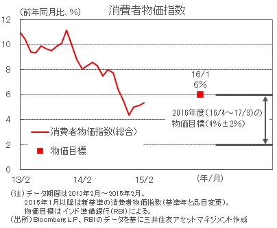 ■2015年2月の消費者物価指数は、燃料や食品価格の安定により、前年同月比+5.37%と比較的安定しており、インド準備銀行(RBI)の2016年1月の目標年+6%を下回って推移しています。RBIは、原油価格が安定して推移することを前提に物価上昇率が目標に向かうと見ています。
