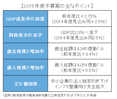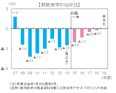 ■予算案全体としては、歳出が前年度比+3.4%、歳入が同+5.5%とされました。財政収支の赤字はGDP比2.0%に低下(2014年度見込みは同2.5%)する計画です。