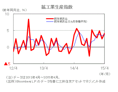 ■4月の鉱工業生産指数は前年同月比+4.1%と、前月の同+2.5%から上昇しました。3カ月移動平均で見ると、このところ同+3%台で推移しています。