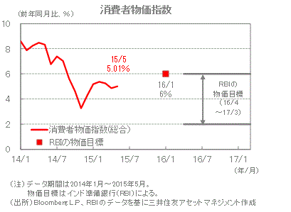 ■5月の消費者物価指数は前年同月比+5.01%と、前月の同+4.87%から上昇しました。ただし、RBIの2016年1月の物価目標(同+6%)を引き続き下回っています。