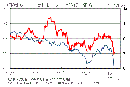 ■豪ドルの動きは、このところ鉄鉱石価格の動きと連動性を高めています。中国の景気に対する不透明感が鉄鉱石価格の下落の背景にあり、こちらも足元で中国株の動きにつれ反発しています。
