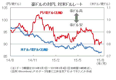 ■政策発表後の為替市場の反応は、豪ドル高円安でした。本日の午前中は90.0~90.5円のレンジで取引されていましたが、会合終了直後に91円超まで上昇しました。中国の景気減速懸念は残るものの、ギリシャ問題が峠を越えたことから、豪ドルは対円で堅調な推移が見込まれます。