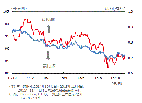 ■11月2日に86.3円前後だった豪ドルの対円レートは、4日の取引時間中に一時87.5円強まで上昇しました。7-9月期の消費者物価上昇率が前年同期比+1.5%と市場予想の+1.7%を下回ったことで、利下げ観測が強まっていたためと見られます。
