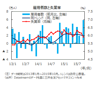 ■10月の雇用者数は前月比5.9万人の増加となりました。月ごとの振れを均すために、政府公表のトレンド値を見ると+1.9万人でした。前月の+2.1万人から鈍化しましたが、引き続き高い水準を維持しています。一方、失業率は9月の6.2%から5.9%に大きく低下しました。失業率の6%割れは今年5月以来5カ月振りのことです。