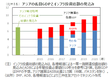 ■アジア開発銀行(ADB)の試算では、ASEAN地域で必要とされるインフラ投資は、年間1,000億米ドル(約12兆円)とされ、現行の投資はその半分にも満たないとされます。ADB傘下の「ASEANインフラ基金(AIF)」に加え、加盟国が出資するAIIBも通じ、インフラ投資が促進される見込みです。