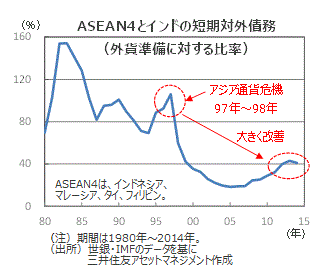 ■報道によると、アジア諸国の企業債務などは08年のリーマン・ショック前に比べて倍増しており、景気減速下で債務への不安が高まっていることを指摘する見方もあります。確かに、短期対外債務の外貨準備に対する比率も13年まで上昇傾向にありましたが、水準はアジア通貨危機当時に比べて大きく改善しています。経常収支の改善なども踏まえると、危機的な状況に発展する可能性は低いと考えられます。