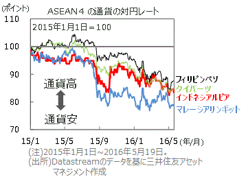 ■通貨は、ASEAN通貨安・円高傾向が続いています。これは、資本流出リスクやそれに伴うリスクオフの流れが、円高に繋がりやすいことが背景です。ただ、足元ではASEAN通貨に底打ち感が台頭してきました。ASEAN経済は成長率が加速するなど好調さを増しています。米国の利上げの可能性が高まっているものの、中国景気が回復傾向にあるなど、極端なリスクオフの動きは回避されると思われます。こうした中、ASEAN通貨は堅調に推移すると予想されます。