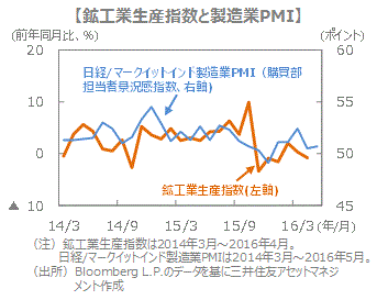■16年4月の鉱工業生産指数は前年同月比▲0.8%と3カ月ぶりのマイナスに転じました。資本財と非耐久消費財が減少しました。非耐久消費財は、干ばつで消費者の購買意欲が減退したことが、生産の押し下げ要因になったと考えられます。一方、16年5月の製造業の景況感は50.7と前月の50.5とほぼ同水準となり、悪化していません。