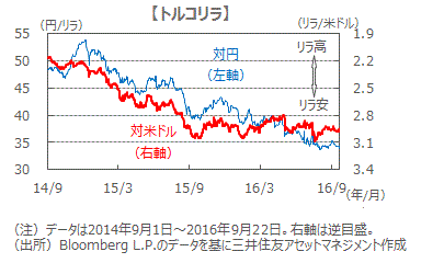 ■金融政策決定会合の声明文では、これまで用いられてきた「引き締め的な金融政策を継続する」という表現が、今回は「慎重な金融政策を続ける」へと変更されました。こうしたことから、中銀は今後も金融緩和を継続すると見込まれます。米国で利上げが見送られたことから新興国通貨が選好され、トルコリラは足元では底堅い動きとなっています。ただし、再び政治的な混乱が起きれば資金逃避の懸念があり、トルコリラは当面安定を模索する展開となりそうです。