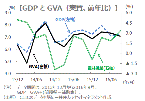 ■11月8日に高額紙幣廃止が発表されました。交換する紙幣が不足しているため、消費に影響が出ています。紙幣不足は数カ月で解消に向かい、混乱は年度内に終息すると思われます。2017年4月の新年度以降は堅調な消費とインフレ低下基調に変化がない中、企業の投資回復などで8%の実質GDP成長率を見込みます。