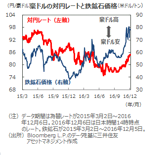 ■RBAは、物価の下振れ懸念から緩和気味のスタンスをとっていますが、①鉄鉱石や石炭に加え、石油輸出国機構(OPEC)の減産合意による原油価格の底入れ、②トランプ次期米大統領の積極財政を支えとする世界的な景気拡大期待などを背景に、今後も豪ドル相場は底堅く推移する見通しです。