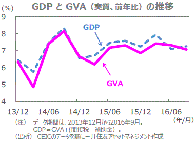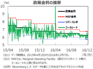 ■今回のMPCでRBIが預金急増にともなう銀行の過剰な流動性を抑制するために導入した一時的な支払準備率の引上げ措置を12月9日に終えると発表しました。同時に、RBIは2017年3月期のGVA(粗付加価値)成長率見通しを+7.7%から+7.1%へ下方修正しました。 ただし、10-12月期にかけて大きく鈍化した後、来年1-3月期にかけて持ち直すことを予想しています。これらを併せて考えるとRBIは、高額紙幣廃止の混乱は年度内に収束すると見込んでいると思われます。金利低下により企業の資金調達が活性化し、インドの経済成長回復の要因となりそうです。