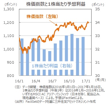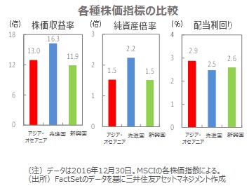 ■今後は、トランプ次期大統領の発言や財政政策の中身を金融市場がどのように評価するか注目されます。内容によっては、市場の変動性が高まる可能性がありますが、アジア・オセアニア株式市場は、①相対的に割高感がない、②1株当たり予想利益が安定している、ことなどから良好な市場と考えられ、世界経済が回復する中、資金の流入と株式市場の堅調な推移が予想されます。