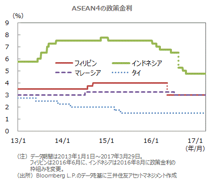 ■東南アジア諸国連合(ASEAN)の主要4カ国(インドネシア、タイ、マレーシア、フィリピン)では、それぞれ17年3月に金融政策決定会合が開かれました。市場予想通り、各国とも現状の金融政策が維持されました。