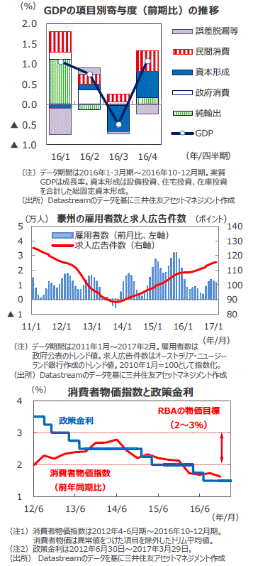 ■ 2016年10-12月期の豪州の実質GDP成長率は、前期比+1.1%になりました。前期の同▲0.5%から改善したのみならず、Bloomberg集計による市場予想の同+0.8%も上回りました。民間消費が堅調を維持したうえ、設備投資、純輸出が回復に転じたためです。民間設備投資は同+1.6%と、10四半期振りにプラス成長となりました。