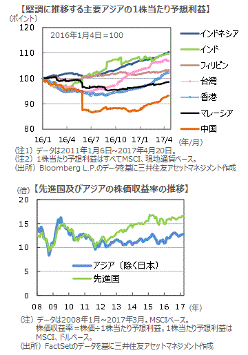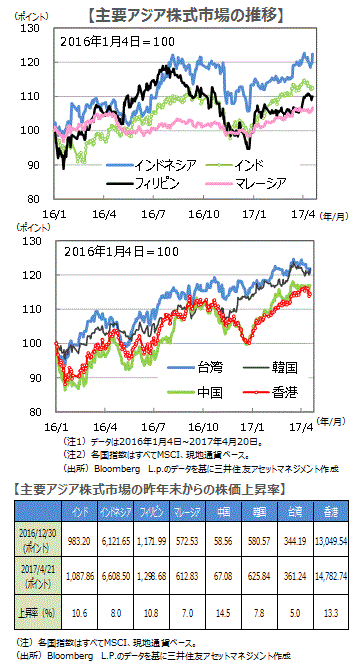 ■2017年に入ってからのアジア株式市場は、トランプ米大統領の政策への警戒感は燻っているものの、中国やアジア全体の経済の好調さや米ドル高の修正などに見られるような資金流入を背景に総じて堅調な展開が続いています。2016年末から2017年4月21日までの上昇率は、MSCIベース(現地通貨建て)で中国が+14.5%、香港+13.3%、フィリピン+10.8%、インド+10.6%と2桁の上昇となりました。インドネシアも+8.0%と堅調でした。