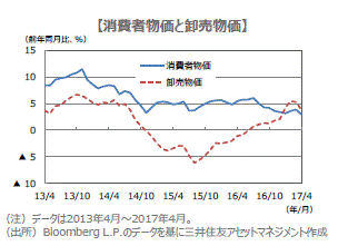 ■4月の消費者物価指数は前年同月比+3.0%と、3月の同+3.9%から伸びが鈍化し、市場予想(ブルームバーグ、同+3.3%)を下回りました。約4割のウェイトを占める食品の伸びが鈍化したことに加え、食品・光熱を除くコアの伸びも同+4.4%と、3月の同+5.1%から減速しました。