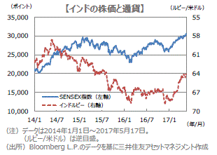 ■17年に入り、インドの株式市場と通貨インドルピーは堅調に推移しています。3月のインド地方選挙でモディ首相の与党、インド人民党が圧勝し、経済改革の期待が高まったことで、海外投資家からの資金が流入したことが背景です。