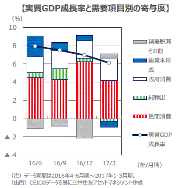 ■1-3月期の実質GDP成長率が前期から大きく減速したのは、16年11月に実施された高額紙幣の廃止に伴う混乱や、GDP統計の大幅改定による一時的要因による影響と見られます。景気の拡大基調は続いていると考えられます。