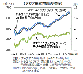 ■今後も北朝鮮は幾つかの重要行事が控えていることから、当面、地政学リスクが意識されることになりそうです。ただ、アジア株式市場は堅調な景気、企業業績などを背景に、17年に入ってから大きな調整局面もなくこれまで地政学リスクを乗り切ってきました。ちなみに、MSCI AC アジア(除く日本)の25日移動平均を見ると、17年以降は同移動平均線が概ね下値の目途となり、上昇トレンドが続いています。