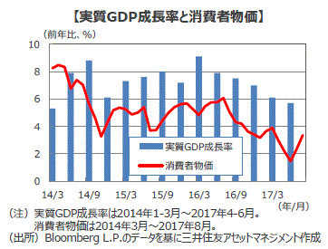 ■2017年4-6月期の実質GDP成長率は前年同期比+5.7%と、市場予想(ブルームバーグ集計、同+6.5%)を下回り、1-3月期の同+6.1%から伸び率が鈍化しました。