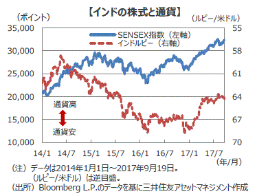 ■インド経済はGST導入の影響から一時的に足踏みしましたが、GSTを巡る混乱は早晩収束し、景気は持ち直すと考えられます。主要株価指数SENSEXは足元で過去最高値圏にあります。中長期的にはGST導入による経済の効率化から企業の利益成長加速が期待され、インド株式は堅調な展開が見込まれます。