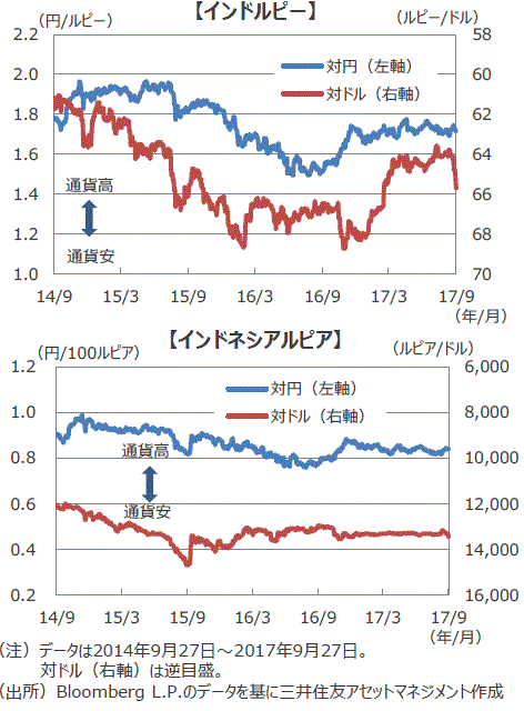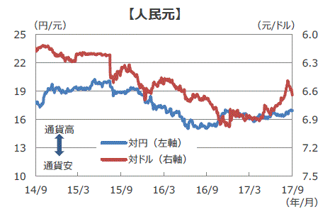■9月のアジア通貨市場では、米金利の上昇に伴うドル反発もあり、人民元やインドルピーをはじめ多くの通貨が対ドルで反落しました。ただし、米利上げのペースは緩やかと見られるなか、投資マネーが経済状況の良好なアジアに流入していることから、アジア通貨は総じて底堅く推移すると思われます。