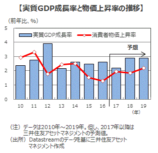 ■雇用の増加や低金利効果等により、家計消費は18年、続く19年と緩やかに増加する見通しです。加えて、資源セクターの設備投資調整一巡、社会資本整備のための公共投資増が見込まれることから、景気の拡大ペースは加速すると考えられます。18年、19年の成長率はともに前年比2.9%程度と予想されます。