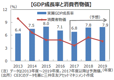 ■17年の景気は16年11月の高額紙幣廃止の影響に加えて、17年7月のGST(物品サービス税)導入を前にした在庫削減の動きなどが経済の停滞を招き、大きく減速しました。4-6月期の実質GDP成長率は前年同期比+5.7%と、約3年ぶりの低水準となりました。しかし、7-9月期は同+6.3%と反転し、GSTを巡る混乱から景気は持ち直しているとみられます。17年度(17年4月~18年3月)の成長率は+6.8%を見込んでいます。